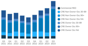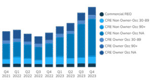 Commercial loans set another new record for non-performing volumes in Q4 2023. Yet, again, marking another two-year high in delinquency and distress. CRE mortgage debt,